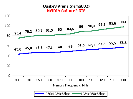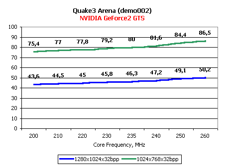 Тем не менее, хочу отметить, что при работе на максимально возможных в данном исследовании частотах 260/440 МГц видеокарта на базе NVIDIA GeForce2 GTS показала просто великолепные результаты в том же Quake3: почти 110 fps в разрешении 1024х768х32bpp, и 63 fps в 1280х1024х32bpp.