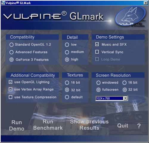 И вот на первые страницы ведущих компьютерных электронных СМИ вышла доселе почти никому неизвестная фирма Vulpine из Германии (Гамбург), которая занимается разработкой 3D Rendering Engines на базе своей технологии Vulpine Vision technology. Фирма достаточно молода, да и работают в ней всего 15 человек, однако она уже довольно успешно ведет свой бизнес. Некоторые компании, занимающиеся разработкой игр, уже приобрели несколько продуктов Vulpine. Тем не менее, фирма не почивает на лаврах и, видимо, желая поднять популярность, объявляет о том, что она выпустила в свет бенчмарк Vulpine GLMark на основе одного из своих движков — The Vulpine Vision Game Engine. Базисом этого движка, как и остальных от Vulpine, является OpenGL. Таким образом, компания как бы в противовес MadOnion 3DMark 2001, рассчитанного на DirectX, выпускает аналог, но под OpenGL. Давайте же посмотрим, сможет ли столь юный продукт составить конкуренцию маститой и проверенной временем MadOnion (в прошлом FutureMark, а еще ранее — группа программистов и художников Future Crew, ставшая очень популярной выпусками нескольких хитовых демо-программ).