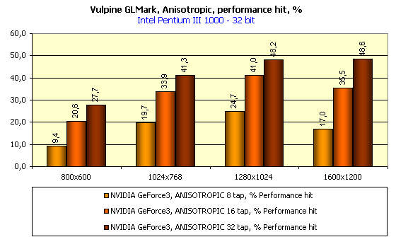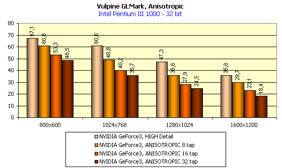 Далее мы посмотрим, как работает анизотропная фильтрация на GeForce3, и что она дает в GLMark. Сразу обращаю внимание на то, что все последующие тесты, по понятным причинам, проводились только в 32-битном цвете (уже нет смысла столь мощные акселераторы гонять в 16-битном цвете).