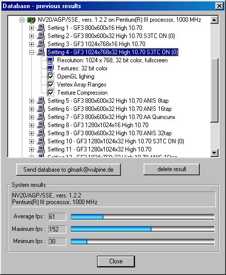 Должен отметить, что "изюминкой" GLMark является обещанная полноценная поддержка NVIDIA GeForce3, то есть демонстрация в действии вершинных и пиксельных шейдеров, а также рельефного текстурирования через Dot3 или EMBM (во всех случаях используются соответствующие расширения OpenGL). Вот почему мы решили непременно опробовать новый продукт и посмотреть, с одной стороны, на то, что может дать тестерам Vulpine GLMark, а с другой стороны, посмотреть на полноценную работу GeForce3.