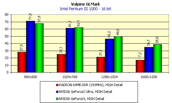 - NVIDIA GeForce3 продемонстрировала блестящее качество, а вот производительность не на столь высоком уровне, впрочем, как и у всех остальных рассмотренных нами карт. Безусловно, GeForce3 — это однозначный лидер, на видеокартах такого уровня можно играть в игры с очень высокой сложностью сцен при хорошей играбельности в популярных разрешениях.