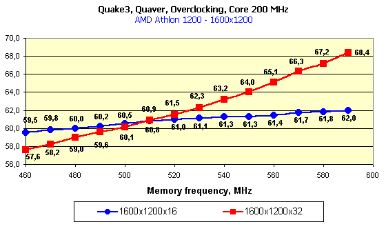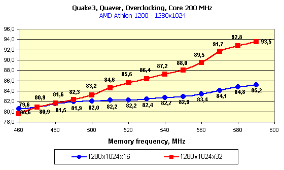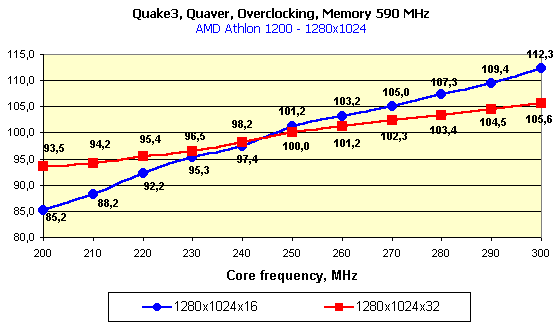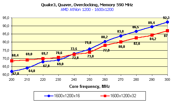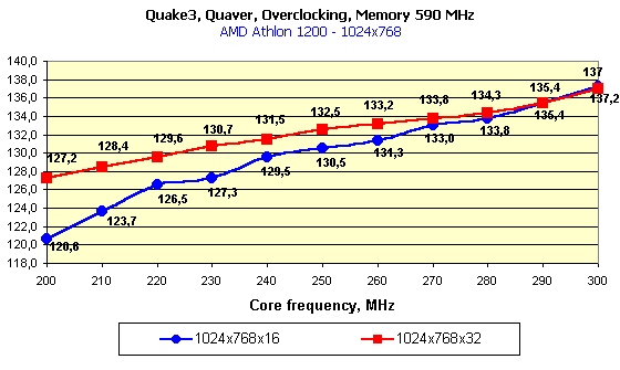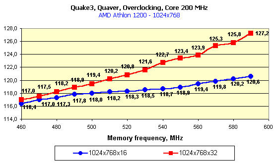 Как и следовало ожидать, в 16-битном цвете разгон никакого эффекта не дает, вся производительность упирается в частоту центрального процессора. Да и в 32-битном цвете картина почти такая же.