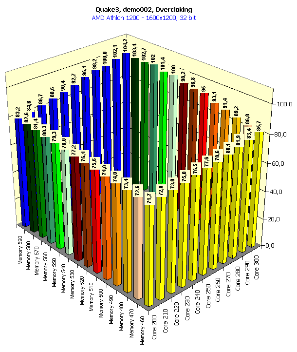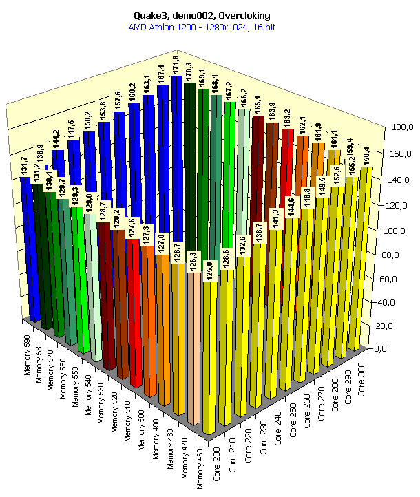 При тестировании снимались замеры через каждые 10 МГц повышения частоты ядра при фиксированных максимальных и минимальных частотах памяти и наоборот. Такой экстремальный разгон в условиях морозильной камеры дал нам возможность получить частоты работы видеокарты на GeForce3 — 300/295 (590) МГц!!!
