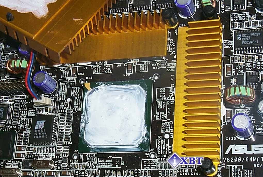 Клипсы подготовливаем к новому монтажу, сильно укорачивая пружину, которая обеспечивает прижим радиатора к плате. На фотографиях выше это все отображено. Затем подготавливаем сам чип, нанеся на него термопасту тонким слоем. И уже после этого устанавливаем сам элемент Пельтье (НЕ ПЕРЕПУТАЙТЕ ОХЛАЖДАЮЩУЮ И ВЫДЕЛЯЮЩУЮ ТЕПЛО СТОРОНЫ!). На снимках ниже это можно увидеть:
