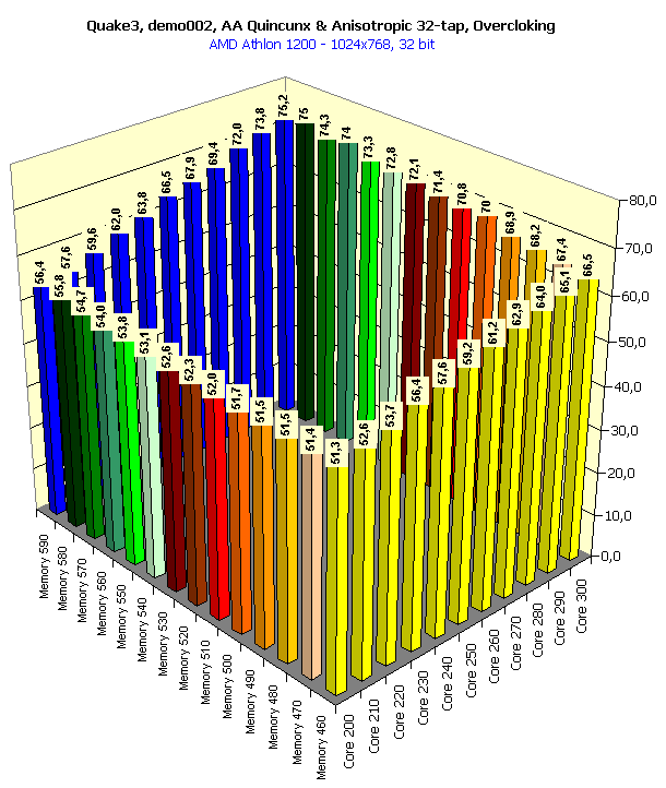 Очень хорошо видно, что разгон дал прирост аж на 47%! Мы получили 75 fps, что доказывает превосходную играбельность в разрешении 1024х768 при 32-битном цвете. Таким образом, имея акселератор с возможностями GeForce3, но работающий на частотах 300/295 (590) МГц, мы можем больше не думать, какой трехмерной функцией, улучшающей качество, пожертвовать. Можно спокойно играть при максимальной анизотропной фильтрации и с анти-алиасингом уровня Quincunx (который является наиболее оптимальных из всех видов АА у GeForce3).
