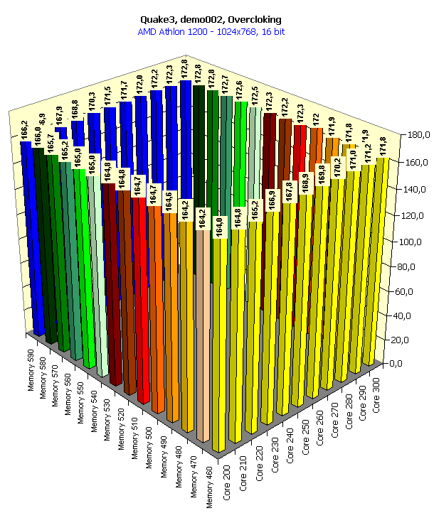 Это тестирование я провел при максимально возможном качестве (детализация геометрии и текстур были наилучшими, использовалась трилинейная фильтрация). На примере этого исследования было интересно посмотреть на сочетание производительности в 16- и 32-битном цвете при раздельном разгоне ядра и памяти.