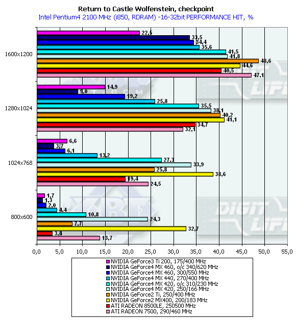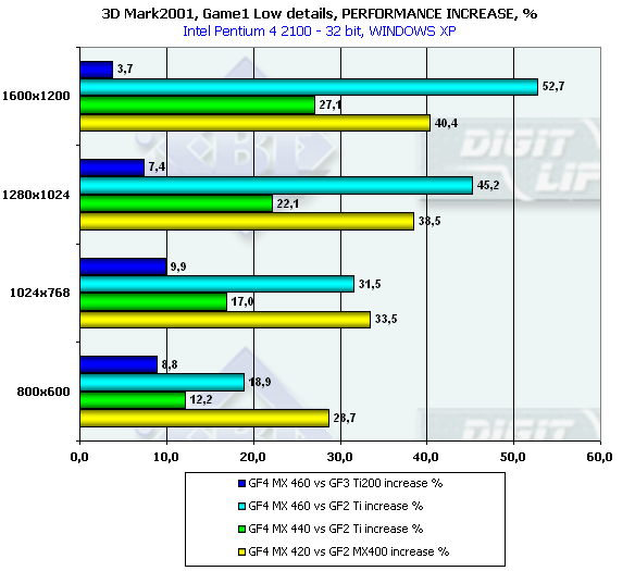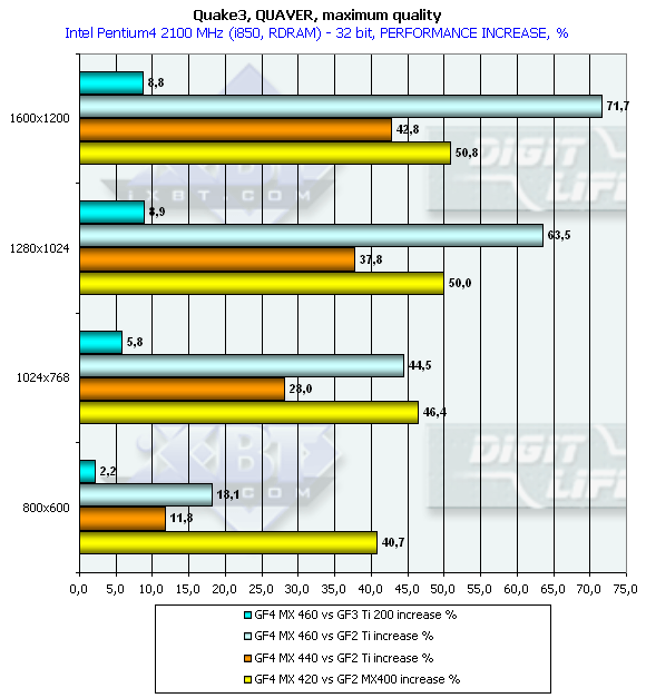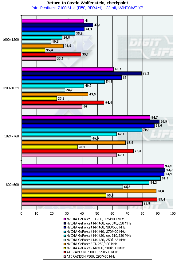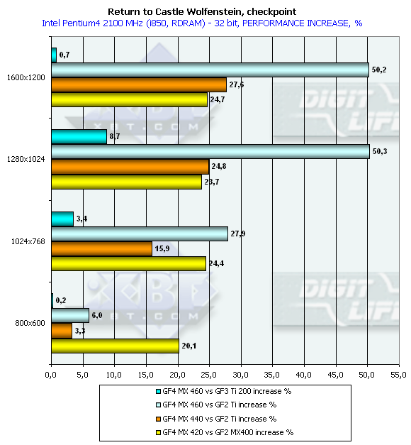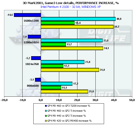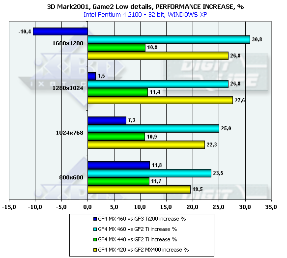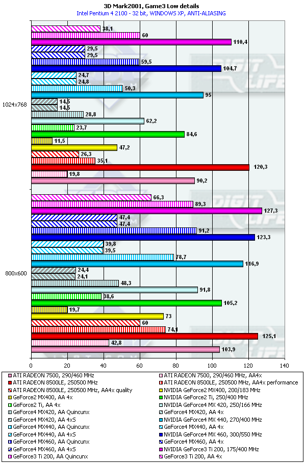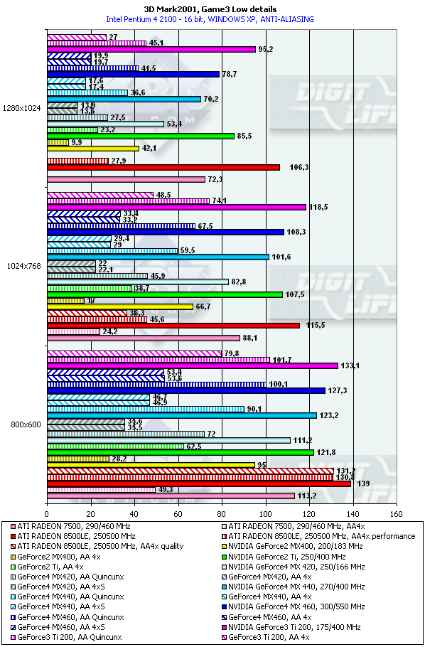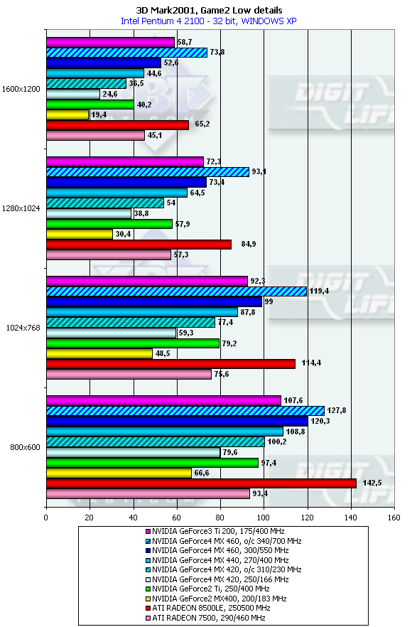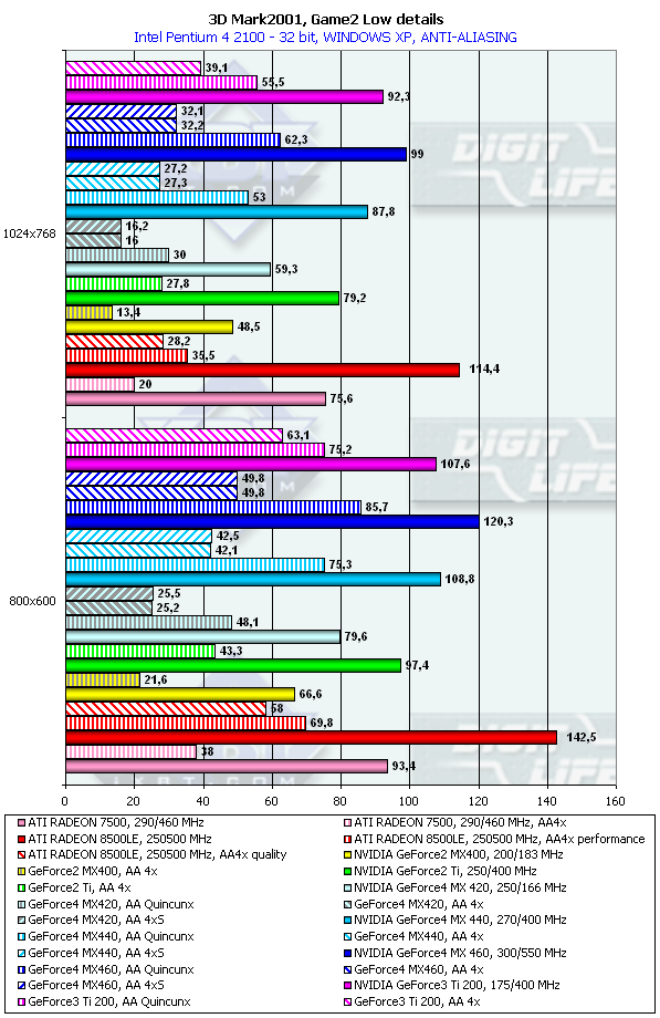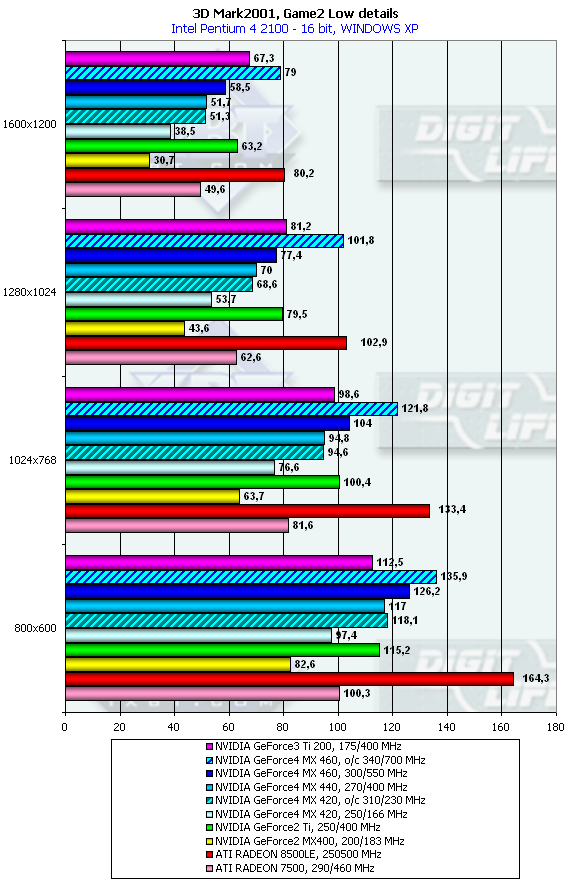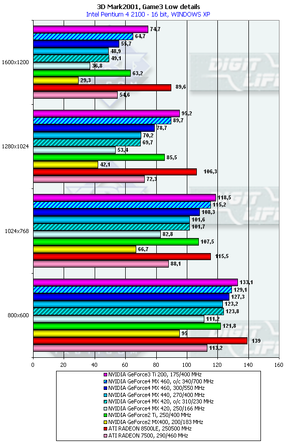 Этот тест оказался для нового семейства GeForce4 MX самым тяжелым испытанием. Преимущества у MX460 над GeForce3 Ti 200 больше не осталось, и эта карта весомо отстала от последней. По-прежнему MX440 неплохо обгоняет GeForce2 Ti, а MX420 — GeForce2 MX400. Борьба с конкурентами от ATI для GeForce4 MX стала уже разочаровывающей. MX440 не выдержал сражения и уступил первенство RADEON 7500 (хотя, если судить по ценовым категориям, то поражения, собственно, нет).