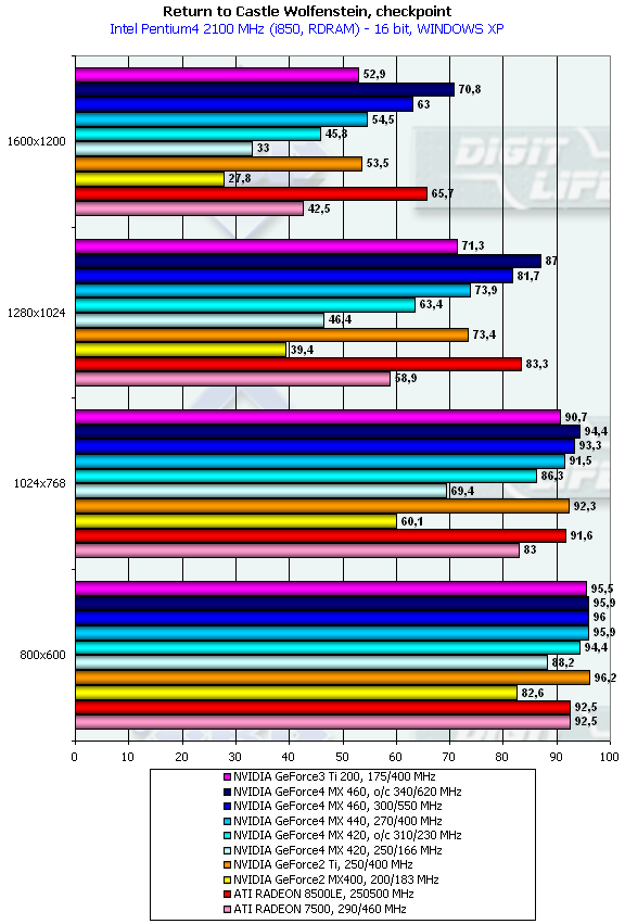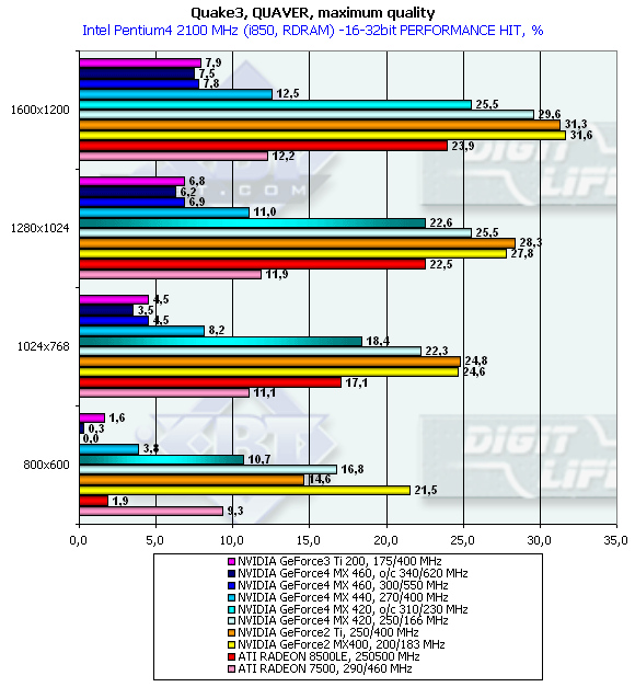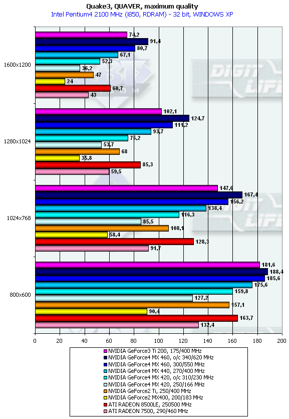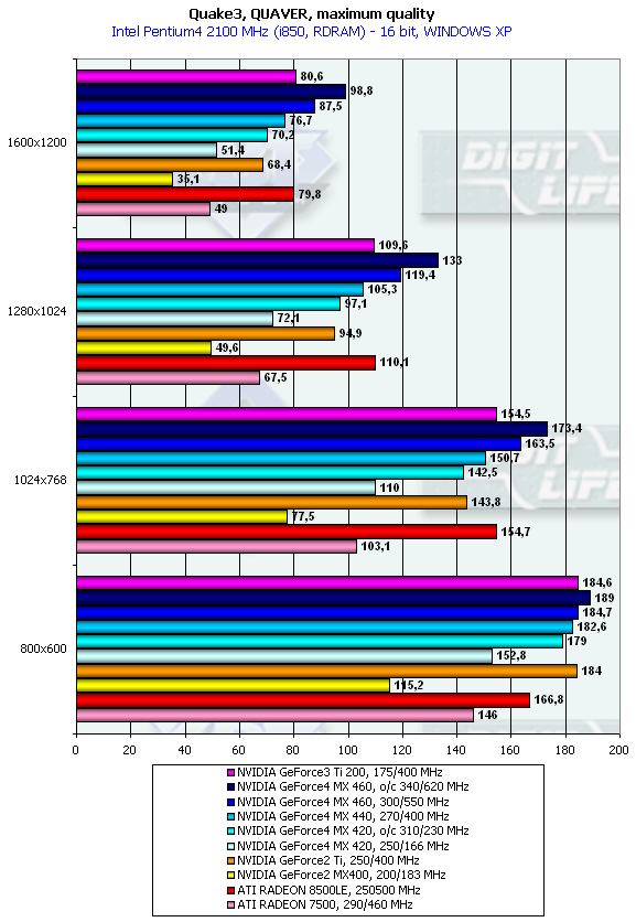 Интересно отметить, что старшая модель MX460 "нос-в-нос" идет с RADEON 8500LE (на младших разрешениях), а GeForce3 Ti 200 безнадежно отстала — сказывается низкая частота ее GPU и, следовательно, ее T&L блока.