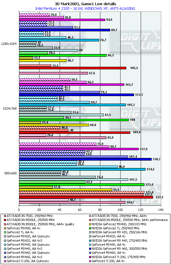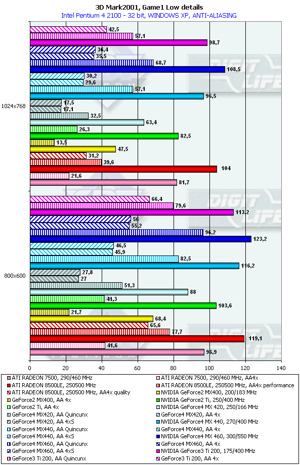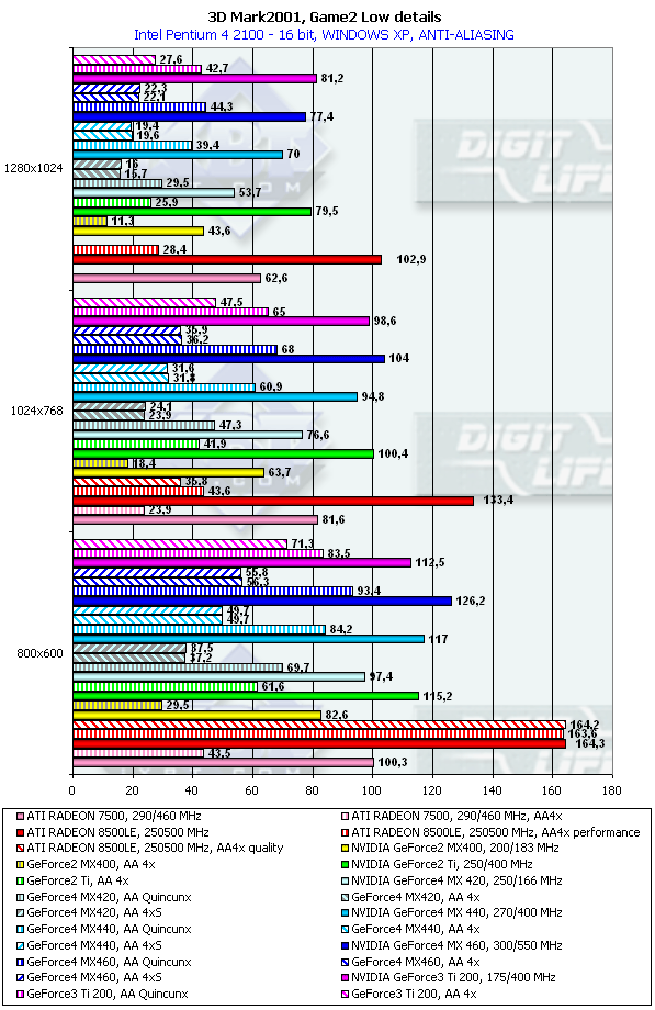 Как мы видим, MX460 и MX440 успешно борятся с GeForce3 Ti 200 в режиме Quincunx, а в режиме 4x "бьют" по RADEON 8500LE и GeForce2 Ti в разрешении 1024х768.