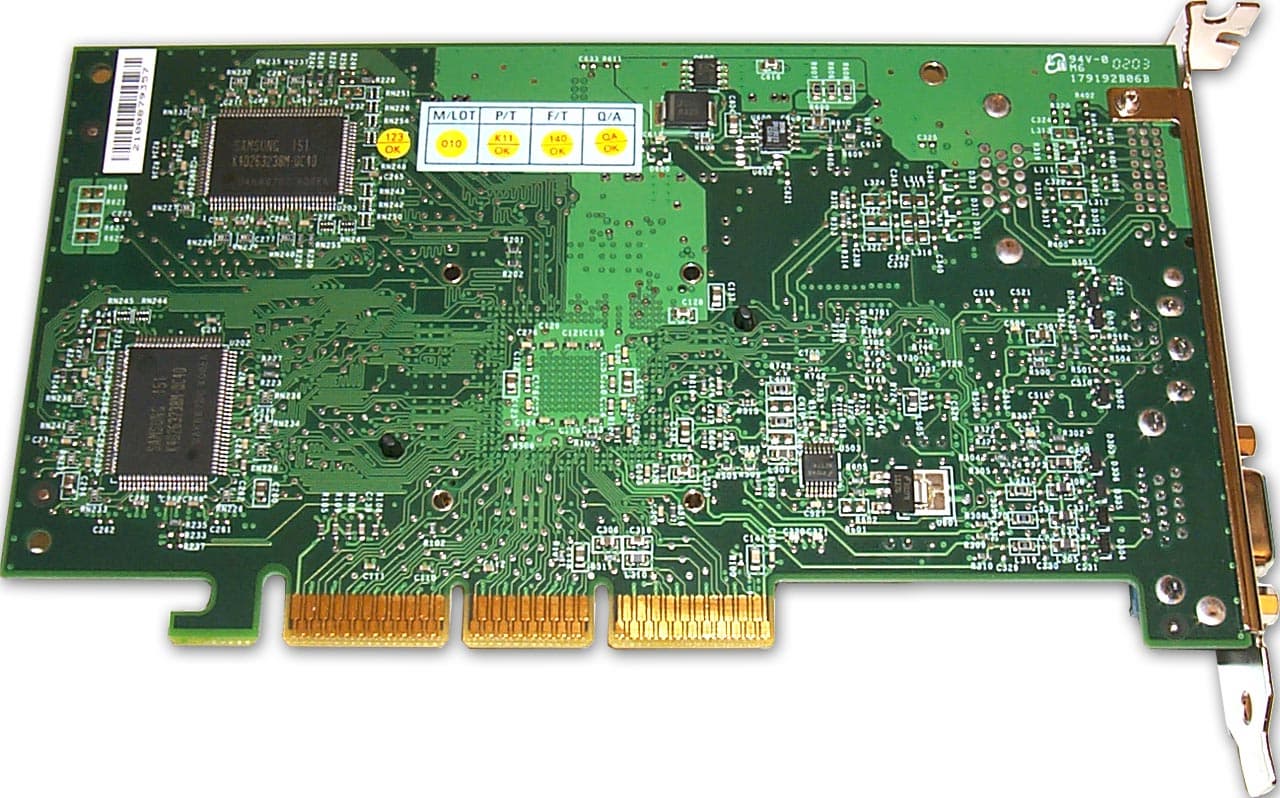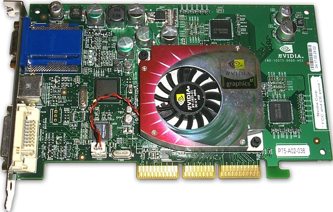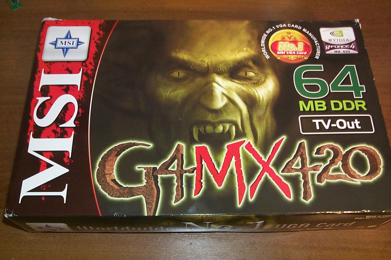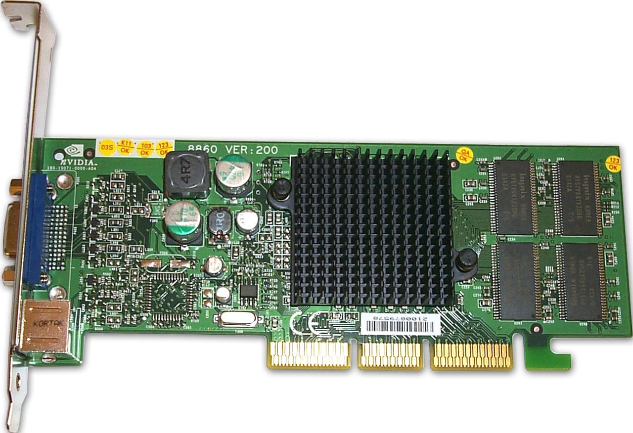 - GeForce 4 MX420 — 250 МГц ядро, 64 МБ 166 МГц 128 бит SDR памяти.