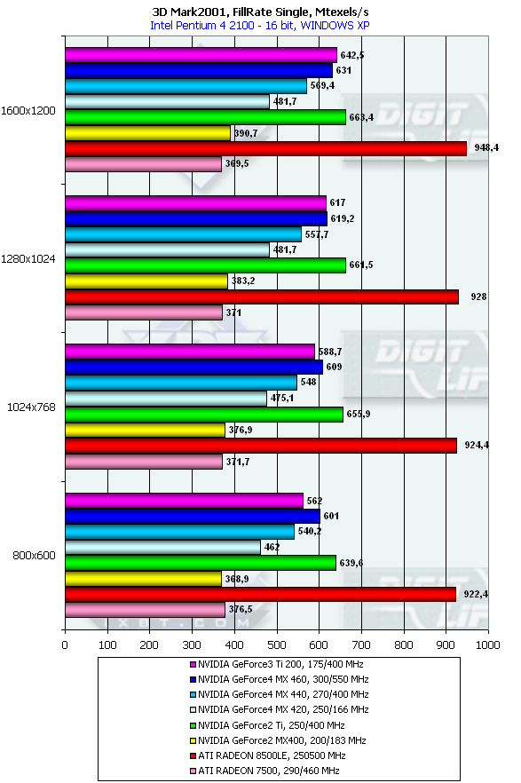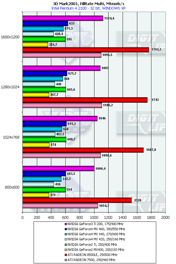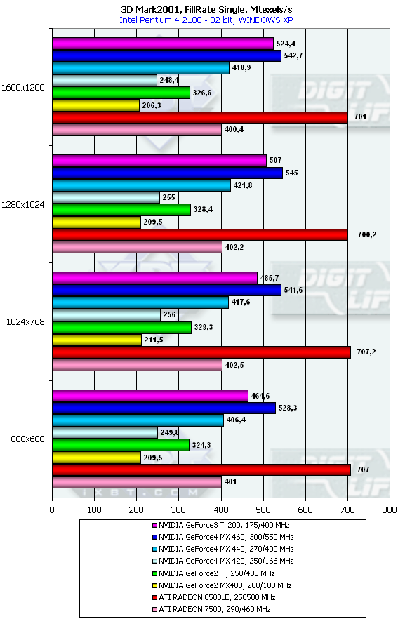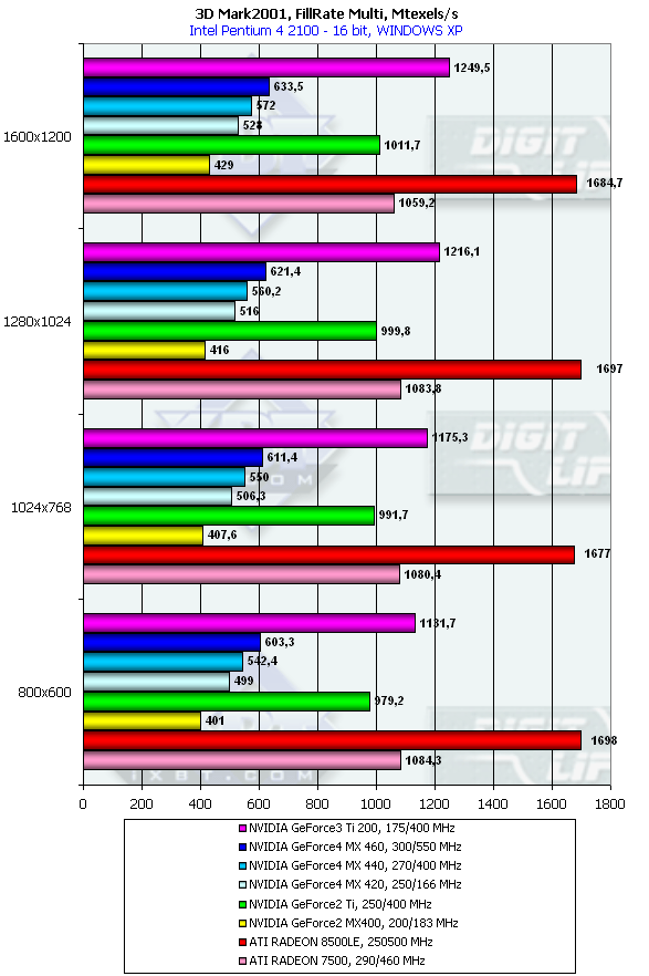 В глаза бросается резкий отрыв у RADEON 8500LE, что, в общем-то, логично, учитывая 250 МГц и 4 конвейера. Интересно отметить, что сильный подъем частоты GPU 2-х конвейерного MX460 (до 300 МГц) поставил его по скорости закраски выше, чем 4-х конвейерный GeForce3 Ti 200, работающий на частоте 175 МГц. Подобный выигрыш был бы невозможен без преимущества в пропускной способности памяти — и здесь MX460 опережает Ti200 (550 против 400).