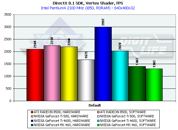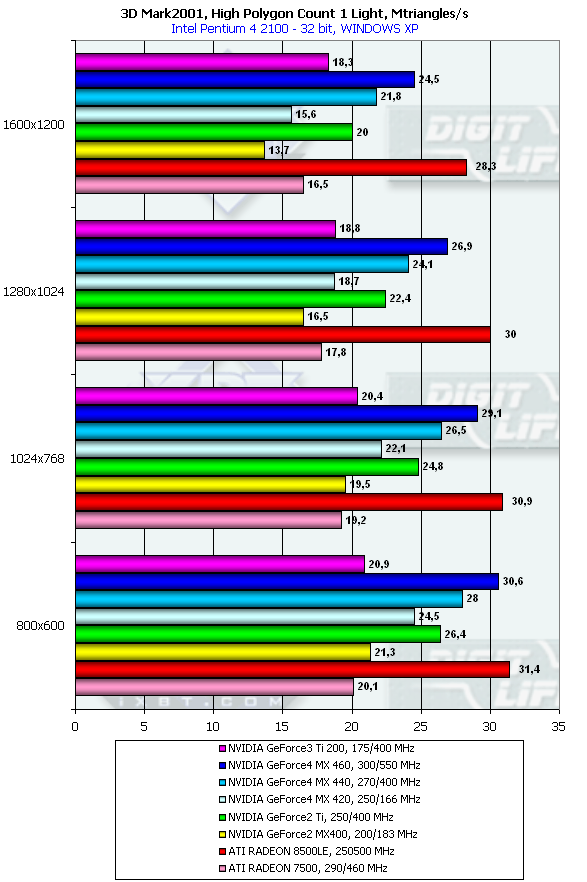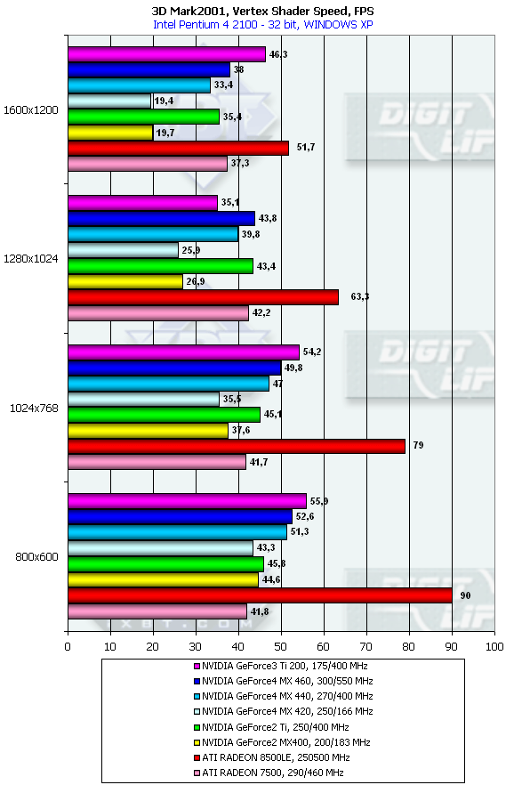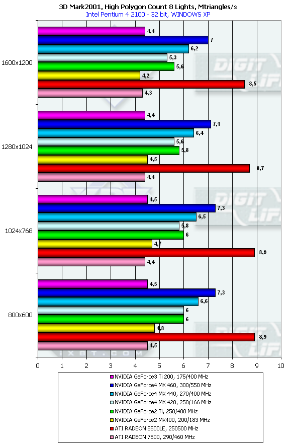 Ситуация очень похожа на предыдущую в части соотношения сил за исключением RADEON 8500LE, скорость работы с 8-ю источниками света заметно выше, чем у конкурентов (известно, что чипы NVIDIA расплачиваются за увеличение числа источников света более существенным падением производительности на каждый добавленный источник — природа этого явления в эмуляции фиксированного T&L специальным шейдерным микрокодом).