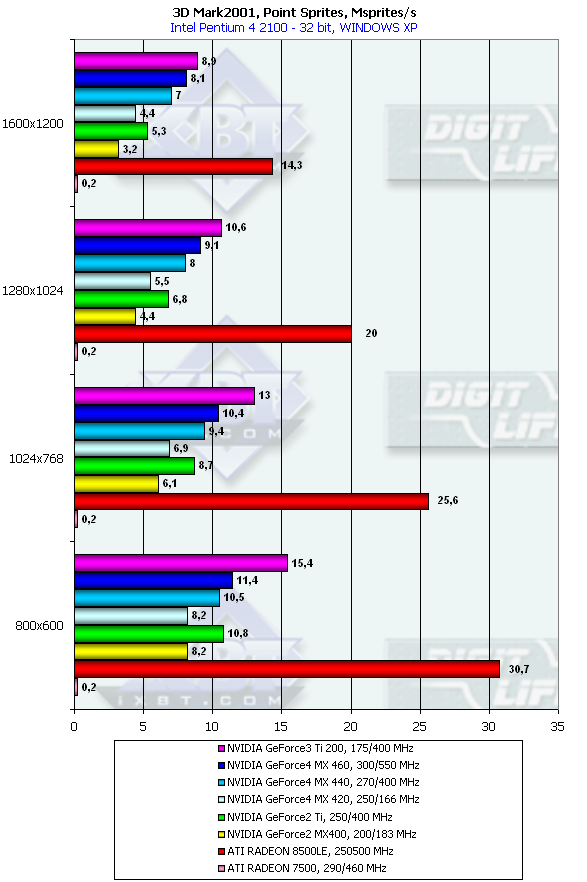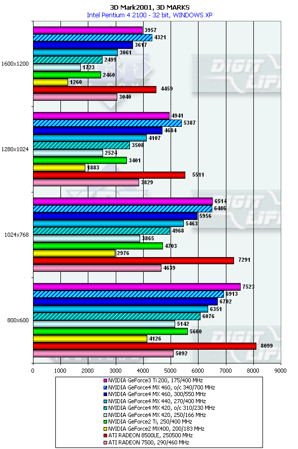 Суммарные результаты говорят, что лидер — RADEON 8500LE, а на втором месте — GeForce3 Ti 200. Новая линейка GeForce4 MX может претендовать только на 3-е место и ниже.