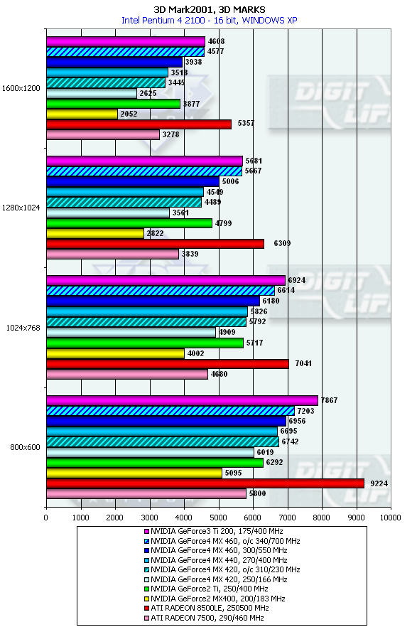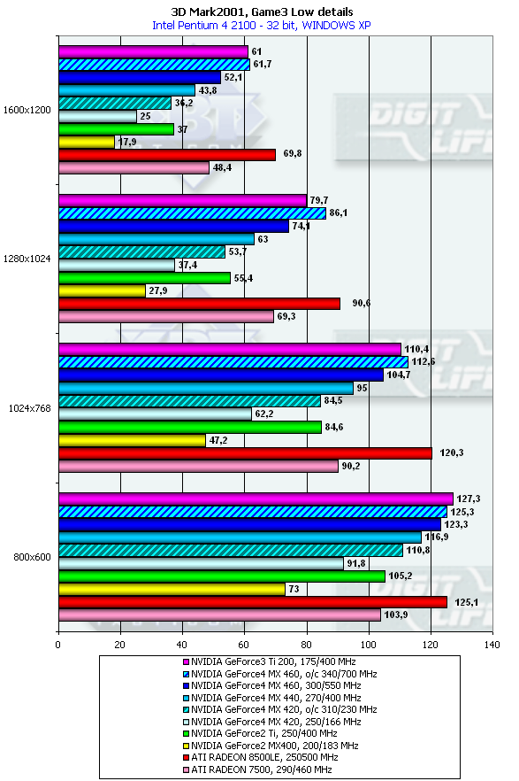 - Предыдущий тезис в отношении MX460 будет верен, только если производители не начнут удешевлять такие платы и не комплектовать более медленной памятью, тогда эта плата явно отстанет по всем статьям от GeForce3 Ti 200.