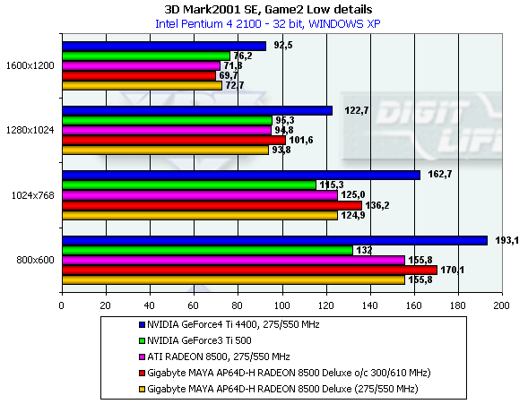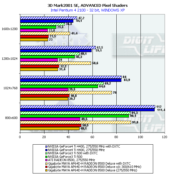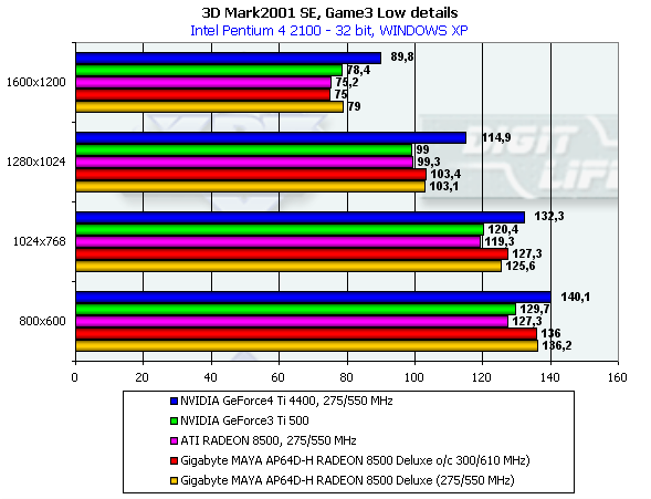 Как видим, более новая версия драйверов от ATI принесла ощутимые дивиденды. В целом же RADEON 8500 оказался на втором месте, проиграв GeForce4 Ti 4400.