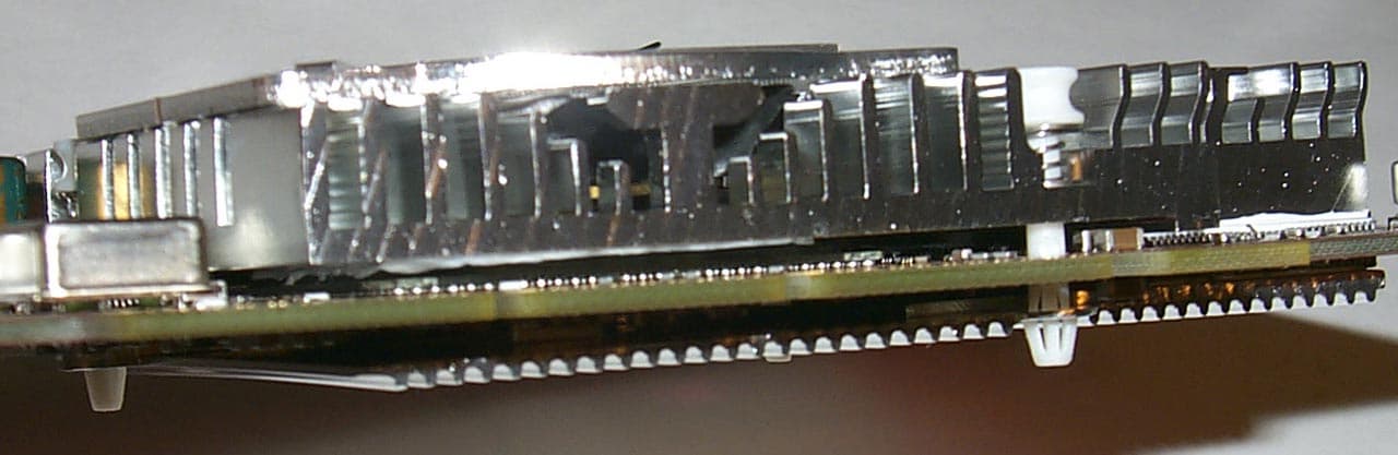 При этом есть вероятность, что такая конфигурация охлаждающего устройства может помешать нормальной установке карты в некоторые системные платы, имеющие конденсаторы между AGP- и первым PCI-слотами: