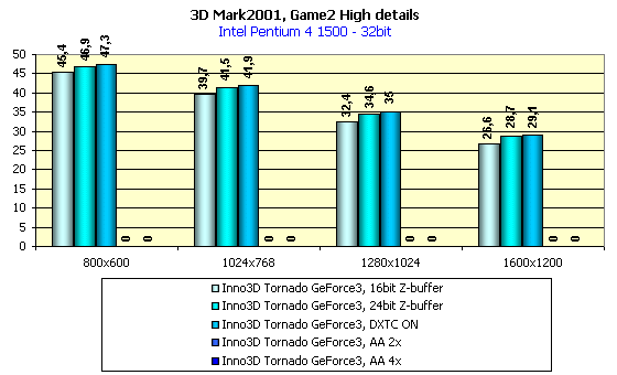 В целом картина такова: мы получаем улучшенное качество 3D-графики засчет заранее скомпрессированнх огромных текстур, и при этом не теряем ничего по скорости, а даже иногда чуть выигрываем. Более подробно о тестировании 3DMark2001 можно узнать из нашего обзора по GeForce3, касающегося работы карт в этом тесте.