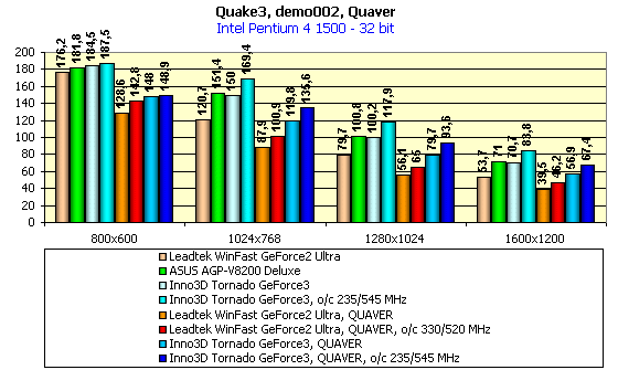 Первые четыре столбца на диаграммах показывают нам работу карт в demo002-тесте, мы видим, что Inno3D Tornado GeForce3 соответствует своему уровню и идет почти вровень со своим собратом — ASUS AGP-V8200 Deluxe. Проводить анализ 16-битного цвета при таких значениях производительности просто не имеет смысла, диаграмма по этой глубине цвета приведена просто для общего плана. Я уже говорил не один раз, что GeForce3 — карты — это акселераторы 32-битного цвета, и надо проводить анализ именно в труколоре. Очень хорошо видно, что даже разгон Leadtek WinFast GeForce2 Ultra до умопомрачительных 330/520 МГц частот не помог этой карте догнать даже неразогнанную Inno3D Tornado GeForce3. И чего уж говорить про разгон последней.