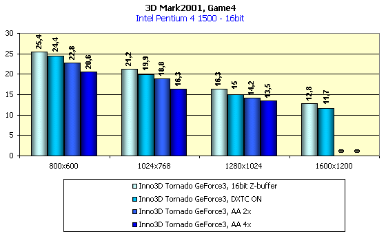 Комментировать результаты активизации анти-алиасинга, думаю, нет надобности, падение производительности находится в обычных для этого режима пропорциях. Я нарочно показал результаты тестирования при Z-буфере разных глубин. Видно, что в 32-битном цвете включение 24-битного Z-буфера подчас приводит к росту скорости относительно работы с 16-битным Z-буфером. Тут возникает недоумение, так как по логике вещей производительность при Z16 должна расти, а тут все наоборот. Вероятно, что это все же какая-то ошибка в 3DMark2001.