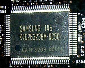 Микросхемы памяти марки Samsung, время выборки 5 нс, что соответствует 200 (400) МГц. В данном случае использована также стандартная, работающая на своих номинальных частотах память. Однако наличие микросхем от Samsung дает понять, что разгоном тут и не пахнет (или он будет очень мал).
