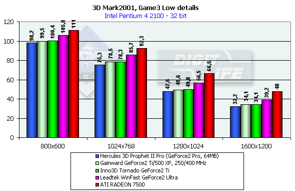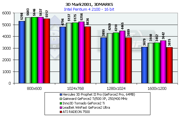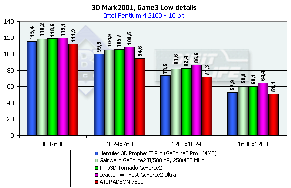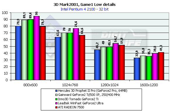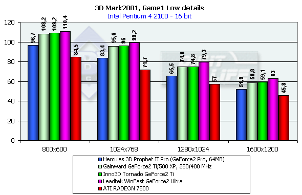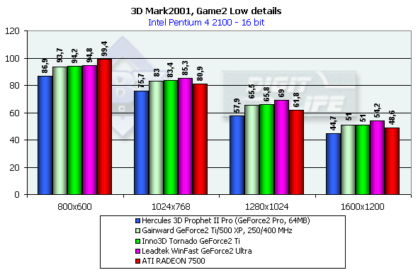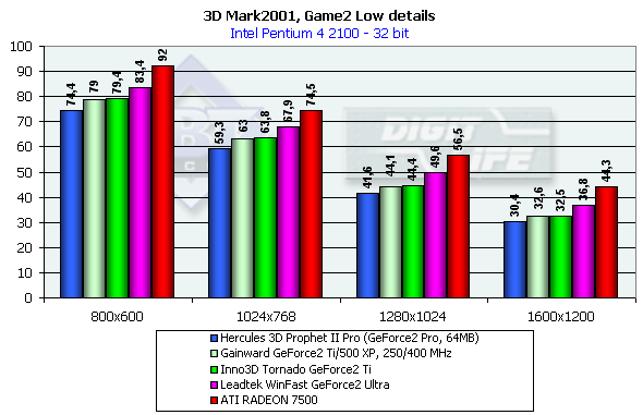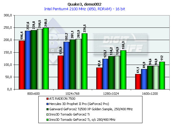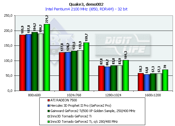 В классе GeForce2-карт все штатно. GeForce2 Ti от Inno3D немного обошла своего предшественника GeForce2 Pro, ее общая производительность находится на уровне ATI RADEON 7500 в 32-битном цвете и значительно выше, чем у последней, в 16-битном.