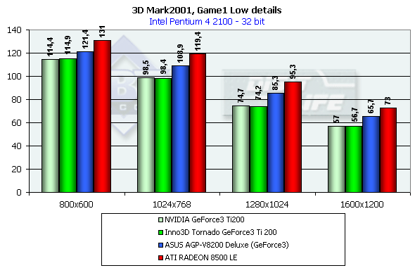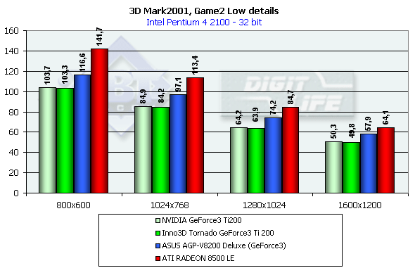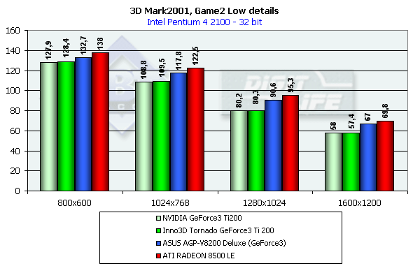 Общая картина схожа с той, что мы видели в Quake3, когда обе видеокарты соответствуют своим уровням по производительности. Также заметим, что ATI RADEON 8500 LE снова опережает Ti 200, и снова видна победа RADEON 7500 над своими соперниками в 32-битном цвете (правда, при сильном отставании в 16-битном).