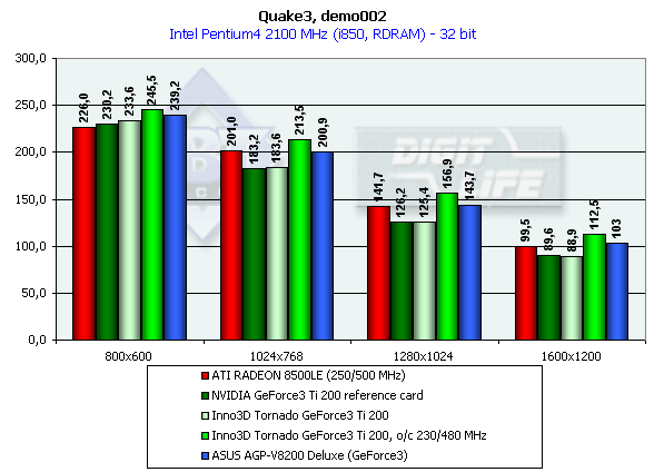 Отчетливо видно, что обе видеокарты от InnoVision полностью соответствуют своим классам, при разгоне Ti 200 обгоняет рядовой GeForce3 и ATI RADEON 8500 LE, однако при работе на штатных частотах Ti 200 уступает плате от ATI (учитывая, что представлена не самая быстрая карта из семейства RADEON 8500).