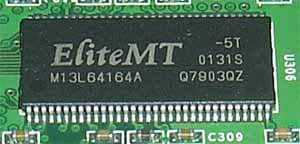 Микросхемы памяти марки EliteMT, время выборки 5 нс, что соответствует 200 (400) МГц. Как мы видим, здесь использована стандартная, работающая на своих номинальных частотах память. Как я уже выше сказал, можно предположить, что для производства таких плат использованы прежние PCB от GeForce2 Pro, на которые установлены более быстрые чипы GPU.