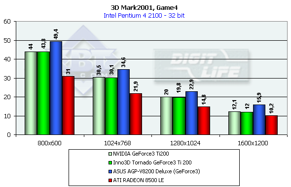 А вот в этом сложнейшем тесте, где требуется хорошая скорость при работе с пиксельными шейдерами, RADEON 8500 LE уже уступил сопернику, и уступил сильно. Как видим, карты на базе семейства GeForce3 пока остаются непревзойденными в играх, где используются пиксельные шейдеры (впрочем, в обзоре RADEON 8500 мы об этом говорили).