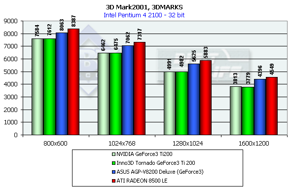 Комментарии излишни: картина уже привычная. 32-битный цвет коронный для RADEON 7500, а в группе Ti 200 лидер RADEON 8500 LE.
