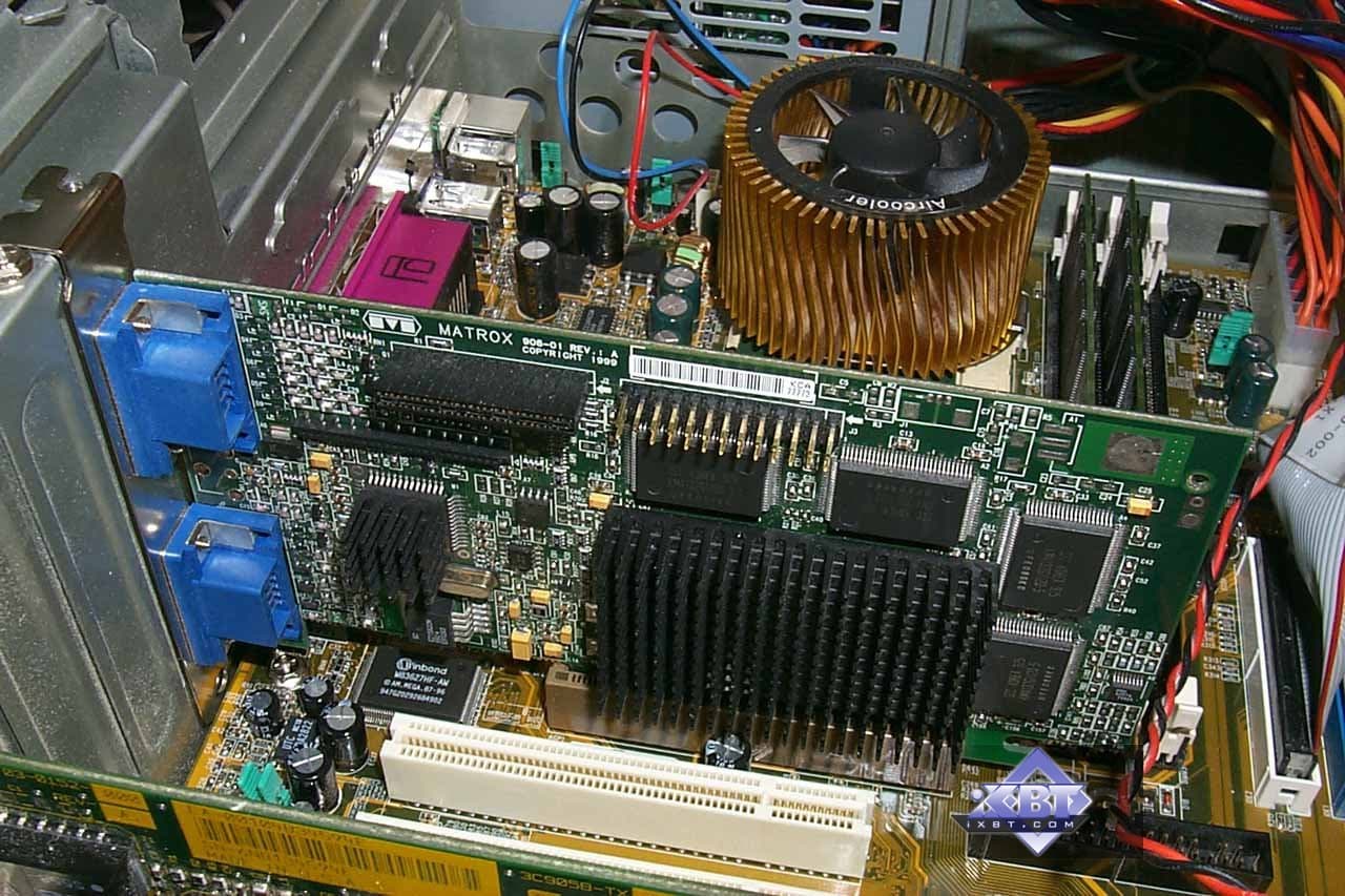 Видеокарты на семействе чипсетов G400 были выпущены летом 1999 года и позиционируются в основном для работы с 2D-графикой высокого разрешения, качество которой традиционно высокое для фирмы Matrox. И если на тот момент мощность и возможности G400 в 3D-графике были на высоте, то ныне они весьма потускнели (и даже повышенные частоты G400 MAX практически ничего не привнесли в этом плане), что и привело к почти полному переходу этих карт в сектор 2D-приложений. Обзоры карт на G400 можно увидеть тут (аналитика) и тут (первый обзор). Подчеркну, что возраст этих материалов — почти 2 года, поэтому самое ценное, что можно из них получить — это узнать о возможностях этих карт. G400 MAX, как более быстрая версия G400, вышел чуть позже в том же 1999 году. Чип отличается не только повышенными частотами работы, но и другим RAMDAC, работающем на 360 МГц. Карты на G400 MAX поддерживают технологию DualHead, которая достаточно подробно рассмотрена вот обзоре по Matrox G400 MAX.