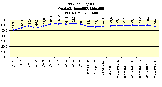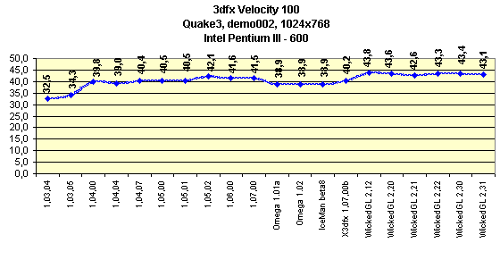 Как можно видеть из графиков, последние версии драйверов от 3dfx (именно от 3dfx!) весьма эффективны по производительности относительно старых версий. Я хочу еще отметить возросшее качество картинки в 3D, которое мы можем наблюдать по мере эволюции драйверов. Если раньше это было сплошное "размывание" картинки, то теперь присутствует четкость линий и т.п. И все же артефакты имеются. Прежде всего, это отсутствие честной трилинейной фильтрации в OpenGL-играх даже при выключении мультитекстурирования (разумеется, в случае включенного второго текстурного модуля на этой карте). Этот факт жесткого включения мультитекстурирования косвенно подтвердила и сама 3dfx. Почему косвенно? Потому как речь шла о Voodoo5, но в сходной ситуации. Однако я могу предположить, что жесткое включение мультитекстурирования в ущерб трилинейной фильтрации осуществлено и в драйверах от 3dfx. Кстати, такую же картину нам демонстрирует и WickedGL-драйвер.