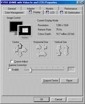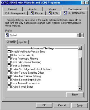 Компания STMicroelectronics уже выпустила несколько бета-версий драйверов для KYRO. При тестировании я использовал последнюю версию 4.44 (версия BIOS 1.80, хотя существует и версия 1.81, однако ее перепрошивка приводит к крайне нестабильной работе карты). Именно проблема с отсутствием нормальных драйверов объясняет то, что обзор вышел только сейчас.