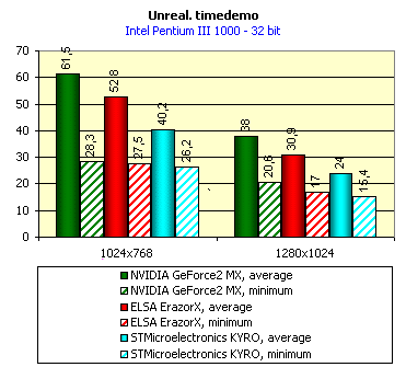 Нетрудно заметить, что карта на базе KYRO проиграла обоим своим конкурентам практически во всех тестах, кроме Expendable в 32-битном цвете. Вывод простой: при данном состоянии драйверов видеокарты на чипсете KYRO практически не представляют собой серьезного конкурента платам на базе NVIDIA GeForce2 MX.
