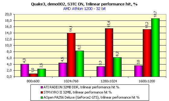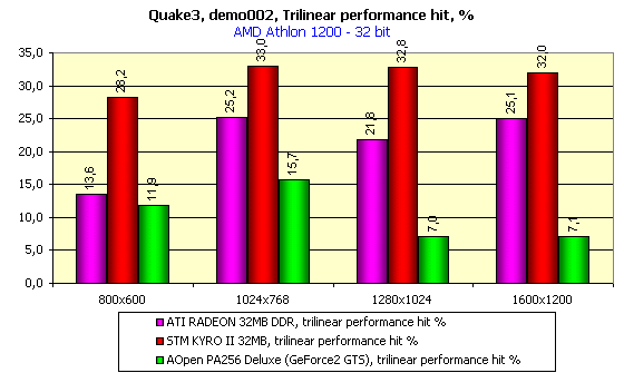 Что мы можем видеть? Прирост производительности без трилинейки у KYRO II настолько велик, что эта карта смогла легко обогнать даже NVIDIA GeForce2 GTS! Вот как это выглядит в процентах: