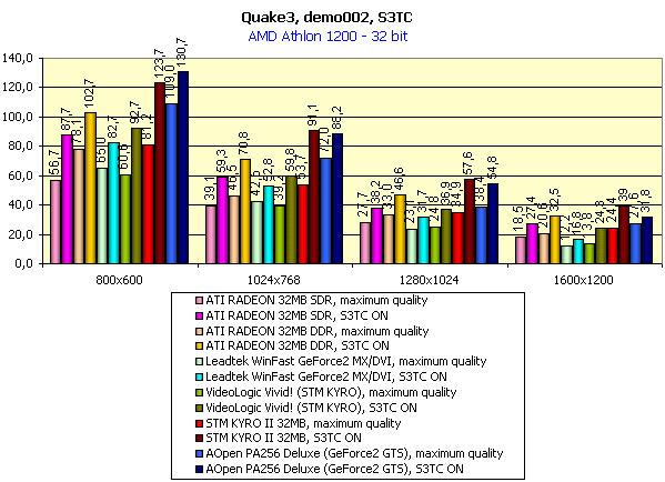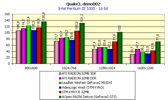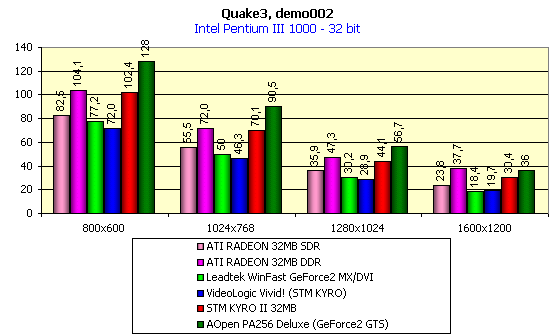 Для сравнительного анализа были использованы результаты следующих видеокарт: ATI RADEON 32MB SDR, ATI RADEON 32MB DDR, Leadtek WinFast GeForce2 MX/DVI, VideoLogic Vivid! (KYRO), AOpen PA256 Deluxe (GeForce2 GTS).