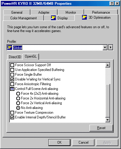Тайловая архитектура здорово снижает требования к пропускной полосе памяти. Но сами по себе спецификации KYRO II выглядят несколько бледно — всего два конвейера с одним текстурным блоком на каждом, SDR память и чип на частоте 175 МГц. В случае большого объема текстур, фильтруемых с учетом большого количества сэмплов (трилинейная или анизотропная фильтрация), даже тайловая архитектура не спасет этот чип, он будет ограничен пропускной полосой своей памяти по текстурам. А в режиме FSAA — величиной fillrate, пускай и очень эффективного. Конечно, если на помощь не придет сжатие текстур S3TC (об этом чуть далее). Но вот насколько строгими будут эти ограничения и определит, выиграет ли чип у классических ускорителей или нет. Впрочем, об этом далее.