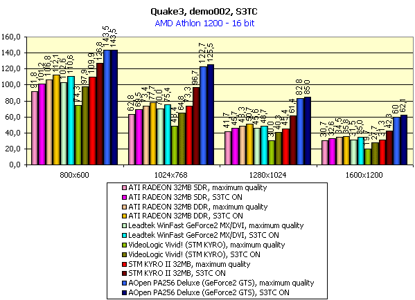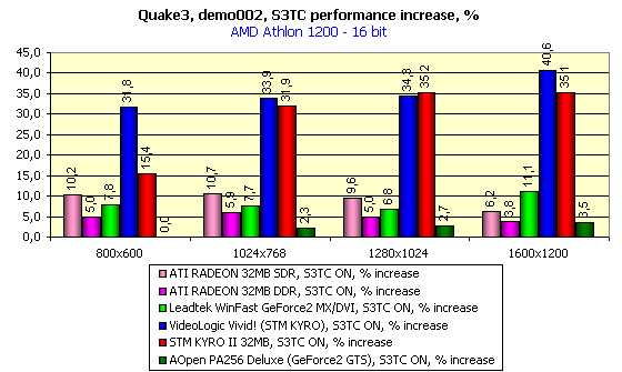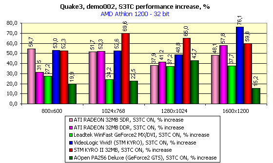 Какие впечатляющие цифры прироста! Обратите внимание на то, что в 1600х1200 у многих карт ситуация с пропускной способностью памяти стала настолько критичной, что даже S3TC перестала существенно помогать, и прирост сократился. А у KYRO и KYRO II все по-прежнему на высоте. Сказывается основное преимущество тайловой архитектуры — объем пересылаемой в буфер кадра и обратно информации в несколько раз ниже, а в большом разрешении это играет определяющую роль