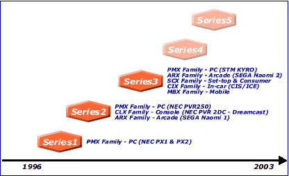 Отметим, что чипы второй серии (PowerVR Series 2) использовались в двух достаточно распространенных приставках и на PC. Мы хорошо помним провал PC чипа PVR250 (Neon), в основном из-за проблем с производством чипов и карт, после чего Imagination Technologies и отказались от услуг NEC в пользу STM. Но это все история, а сегодняшний день гораздо более интересен. Серия 3 замахивается на автомобильные компьютеры и даже (!) на мобильные применения. Причем, судя по всему, не в смысле ноутбуков, а в смысле мобильных телефонов и PDA. Кроме PC чипов, присутствуют set-top боксы и еще одна аркадная приставка. В мире же топовых 3D приставок KYRO подобным чипам сейчас конкурировать сложно — ужасающая мощь PSX2 или XBox напугала его создателей. Но, возможно, к следующему поколению (Series 4) они оправятся от испуга.