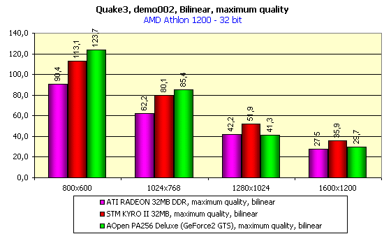 Раз уж речь зашла о режиме тестирования с наилучшим качеством, то нелишне будет напомнить, что в данном тесте принимает участие трилинейная фильтрация. Мы знаем, что у KYRO/KYRO II она реализована честно, а не через аппроксимацию. Также хорошо известно, что при подобной архитектуре конвейеров (2 конвейера и по одному TMU на каждом), например, у NVIDIA Riva TNT2 при условии принудительного включения честной трилинейки наблюдается просто катастрофическое падение производительности. Поэтому давайте посмотрим, как обстоит дело при отключенной трилинейной фильтрации в 32-битном цвете: