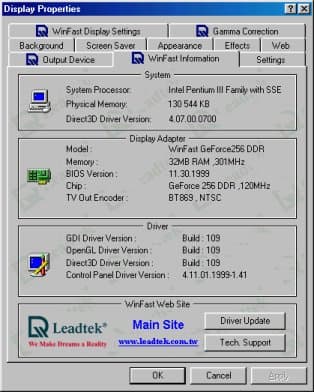Работа с любой видеокартой начинается с установки драйверов. Рассмотрим особенности поставляемых фирмой Leadtek драйверов. При тестировании использовались драйверы от Leadtek версии 1.09: