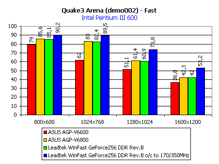 Этих инструментов вполне достаточно для того, чтобы показать производительность видеокарты. Для наглядности на диаграммах приведены скоростные показатели еще двух видеокарт на GeForce 256: ASUS AGP-V6600 с памятью типа SDR SDRAM и ASUS AGP-V6800 с памятью типа DDR SDRAM. Также мы покажем работу видеокарты Leadtek WinFast GeForce256 DDR rev.B и при разгоне.