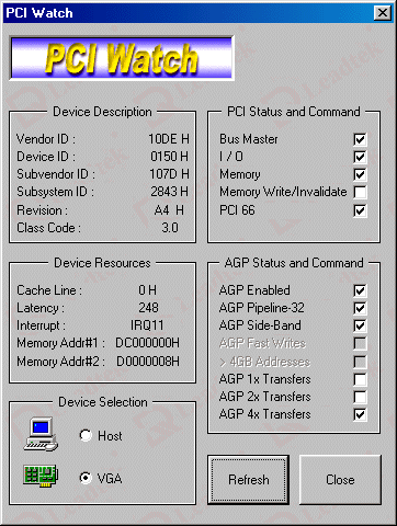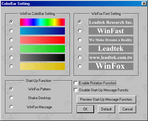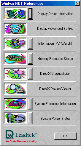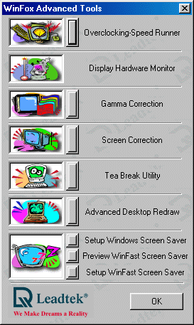 Ну, если с утилитой по разгону все ясно, то второй (недоступный в данном случае) пункт говорит о том, что Leadtek тоже взялась за идею мониторинга работы видеокарт. Правда, это пока реализовано лишь в одной плате на базе NVIDIA GeForce2 MX (мы ее рассмотрим в ближайшее время).