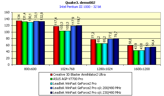 Итак, карта Leadtek WinFast GeForce2 Pro продемонстрировала очень хорошие показатели по производительности. Играбельность у данной платы находится на высоком уровне практически во всех разрешениях, даже в 1600х1200х32 можно играть в некоторые single player игры. При этом пользователь платит за карту на базе GeForce2 Pro ощутимо меньшую сумму (сейчас можно сэкономить около $100), чем за плату на базе GeForce2 Ultra.