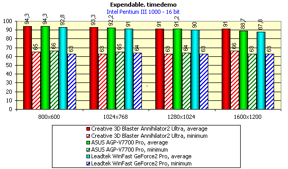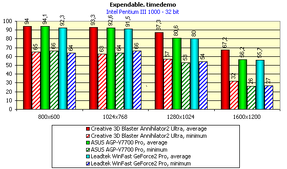 Обратите внимание на то, что в 16-битном цвете в Expendable платы на GeForce2 Pro практически не отличаются от более дорогих собратьев на GeForce2 Ultra, и производительность обоих карт "упирается" в производительность CPU системы. Только в Quake3 можно видеть некоторое падение по скорости с ростом разрешения. Если в 16-битном цвете частота графического ядра еще играет определенную роль (посмотрите на отличия между производительностью разогнанной Leadtek WinFast GeForce2 Pro до частот 200/480 Мгц и ее же скоростью на частотах 230/480 МГц), то в 32-битном цвете наблюдается все тот же эффект "бутылочного горлышка" — все зависит от скорости памяти, то есть ее пропускной способности. Изменение частоты работы графического ядра практически не влияет на прирост по скорости. Интересно отметить, что уже очень мало отличий в 32-битном цвете между картами на GeForce2 Pro в разогнанном виде и GeForce2 Ultra. Это очень важный момент, особенно в свете того, что карты на базе GeForce2 Ultra стоят дороже.