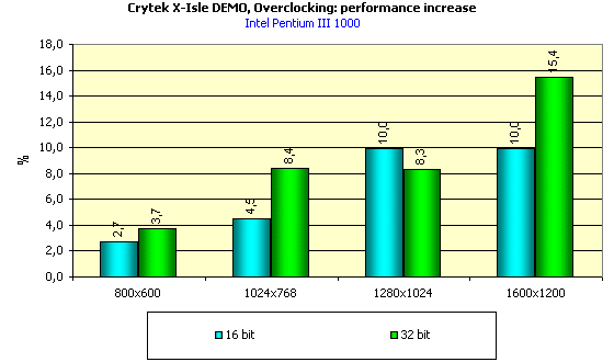 Я уже обращал внимание на то, как "просаживаются" даже мощнейшие акселераторы на такой сложной графике. Можно видеть, что видеокарта Leadtek WinFast GeForce2 Ultra в данном тесте оказалась лучшей. Попробуем и в данном случае оценить прирост производительности при разгоне: