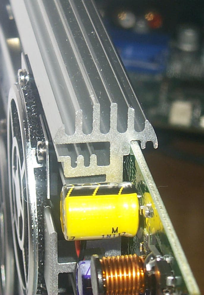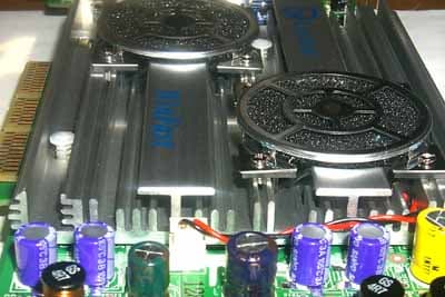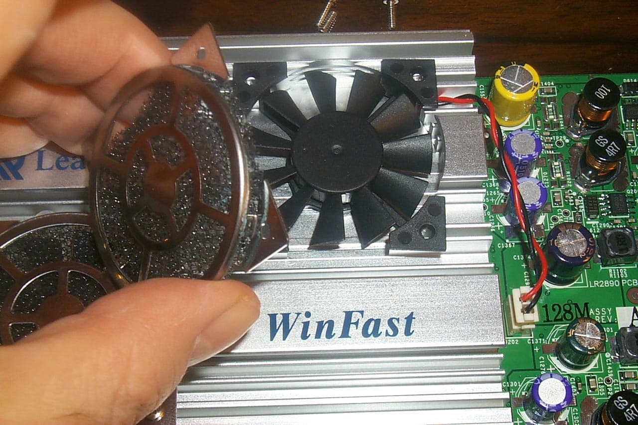 Сразу в глаза бросается наличие двух вентиляторов (еще бы! такой огромный радиатор одним вентилятором охлаждать бесполезно!). Интересная деталь: под решеткой каждого из них имеется пылезащитная сетка, которая… весьма мешает тем, что задевает за лопасти вентиляторов и создает дополнительный шум. Поэтому пришлось снять эти детали: