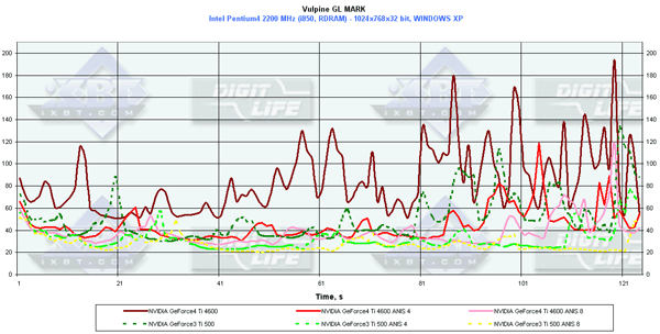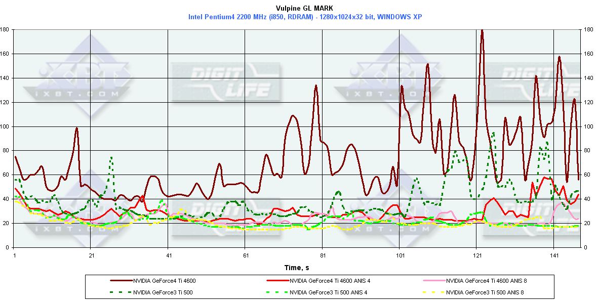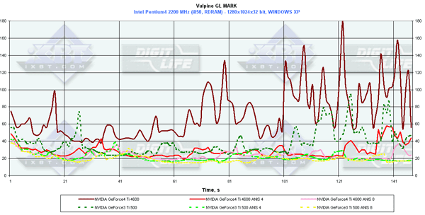 Я напомню, что этот тест вышел год назад для демонстрации мощи тогдашних фаворитов 3D-графики — карт на базе GeForce3. Тогда эти платы просто "проседали" под натиском огромного числа полигонов и эффектов в этом тесте. Прошло много времени, и вот новые фавориты демонстрируют нам уже очень хорошую играбельность (ну, разумеется, если бы были такие игры).