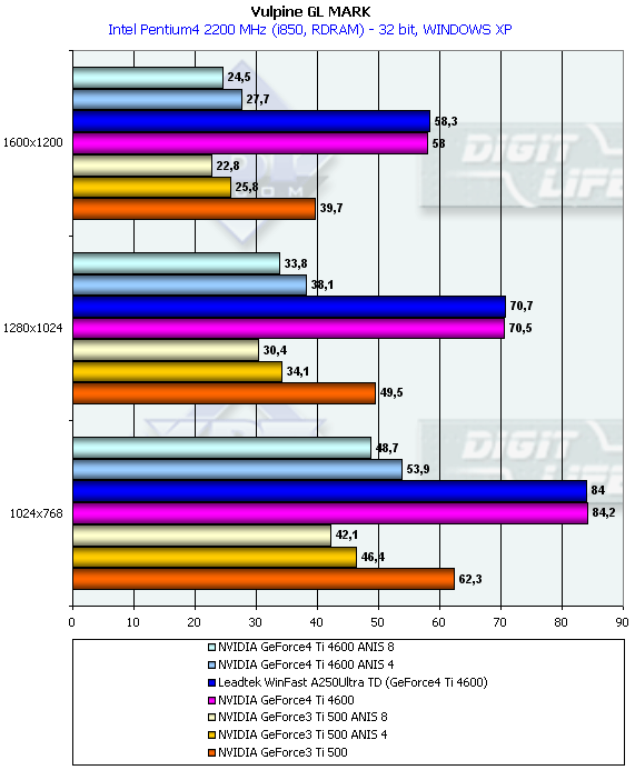 Забегая вперед, отмечу, что эта карта в плане производительности ничем не отличается от ранее рассмотренных эталонной и MSI GF4Ti4600, поэтому я не стал в этот раз проводить много тестов и сравнивать Ti 4600 с конкурентами от ATI (все равно как по производительности, так и по цене :-) монстру от NVIDIA нет пока равных). Мы можете также посмотреть наши 3DGiТоги, где Ti 4600 рассматривается весьма подробно. В этой статье я затрону еще раз вопрос работы анизотропной фильтрации на примере тяжелого теста Vulpine GLMark.