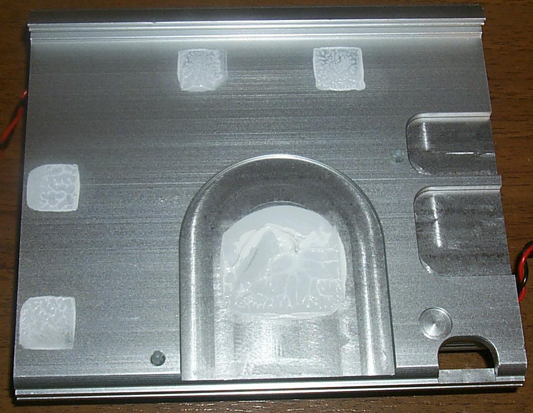Система крепления всего устройства — это два пластмассовых штифта и "козырек" у большого радиатора, которым тот цепляется за PCB. Несмотря на кажущуюся прочность такого смешанного крепежа, можно все же поставить под сомнение то, что такие хлипкие клипсы смогут долго и прочно удерживать такую махину весом, наверное, не менее 0.5кг.